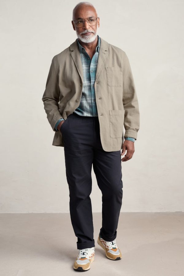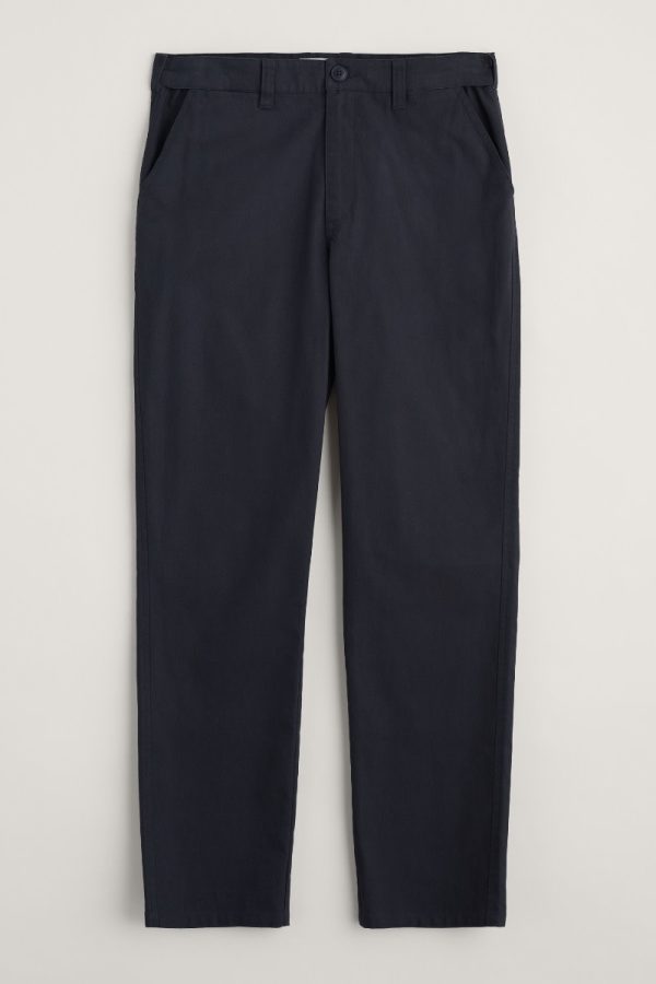 Slightly tapered trousers crafted from durable organic cotton with practical heritage details. Small elastic inserts in the inside waist give a comfortable flex to the fit, and a handy coin pocket is positioned on the hip beside the angled pocket.