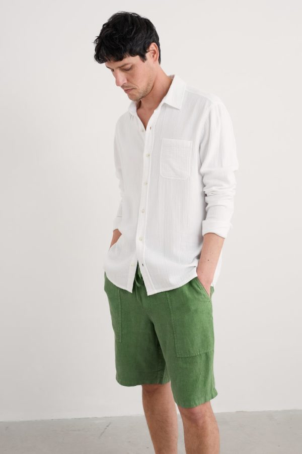 A relaxed fit shirt, made from GOTS-certified organic cotton. Its soft, almost springy handfeel is thanks to the double gauze construction, created by stitching two fine layers together. This creates a lightweight and gently textured fabric that’s perfect for summer wear. The mock horn buttons on the placket and cuffs provide a touch of contrast, while the chest pocket and split side hems add classic smart-casual details.