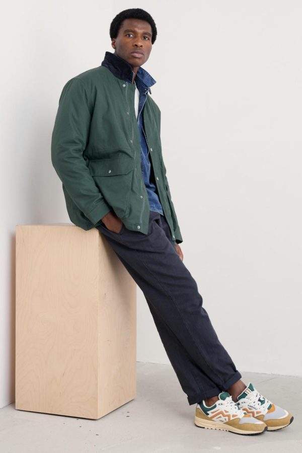Our worker jacket-inspired coat is just the thing for the (slightly) warmer weather. The relaxed-fit coat is made from organic cotton, and is lightly padded with recycled polyester wadding for just that extra touch of snugness. We’ve added a pair of generous patch pockets, which have darts for added volume, as well as lined side entry pockets. The collar in contrasting cord provides a stylish finishing touch. A coat to take you through the seasons.