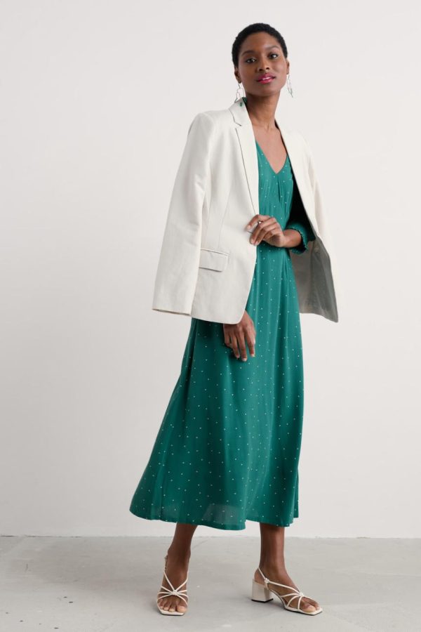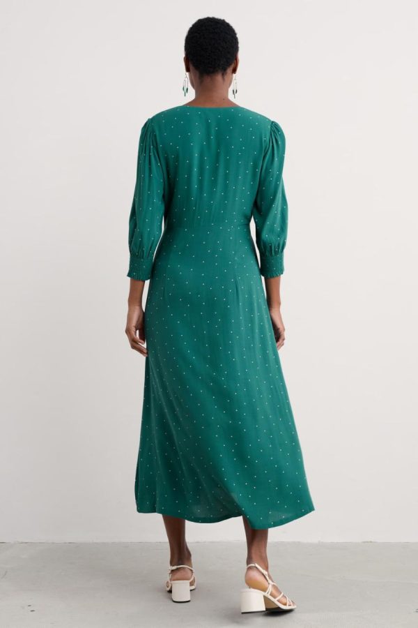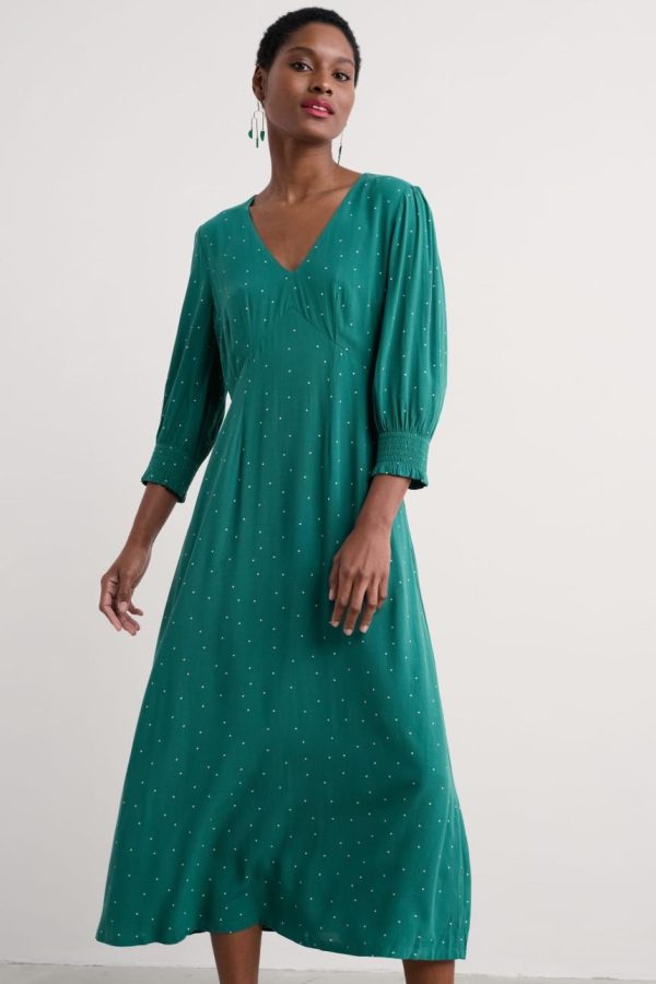 With its full, long skirt and drapey fabric, the Bell Gable Dress has a lovely sway and movement when you walk. Its empire line cut and bust darts create a flattering outline, with the deep V-neckline adding a subtly elegant touch. Pretty smocking at the cuffs gives the printed dress a summery feel.