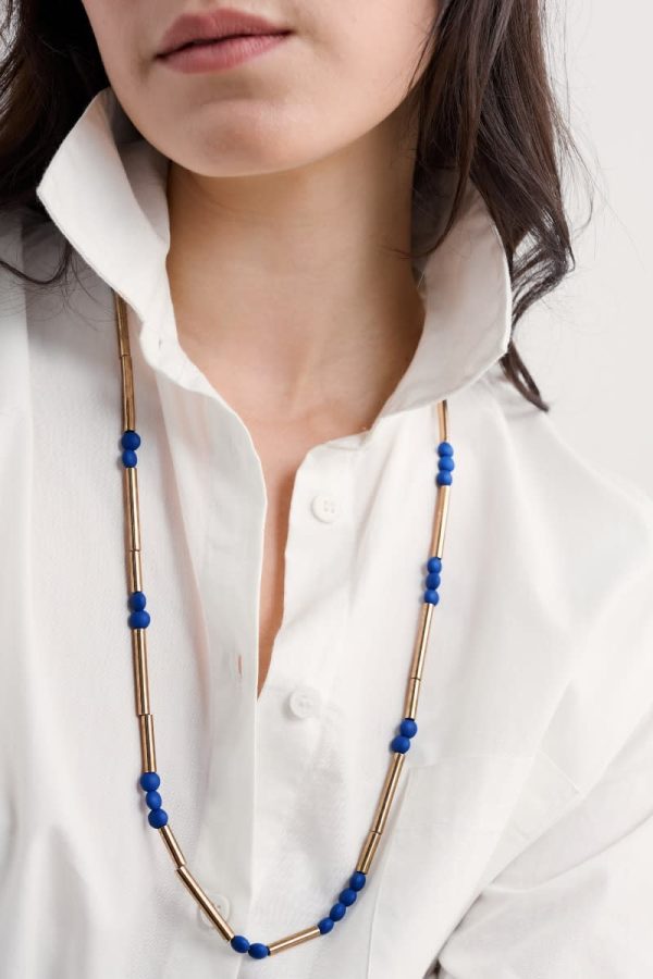 The warm gold tones of our Bowjey necklace contrast with the bright pops of colour from the beads. Its long and sleek design makes it an elegant way to complete your outfit, and you can adjust the length to best suit your style.