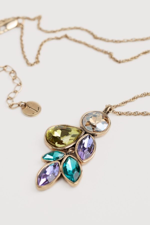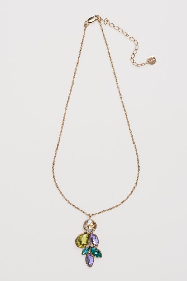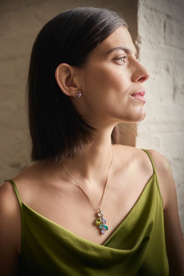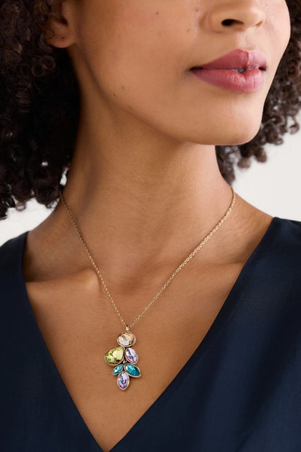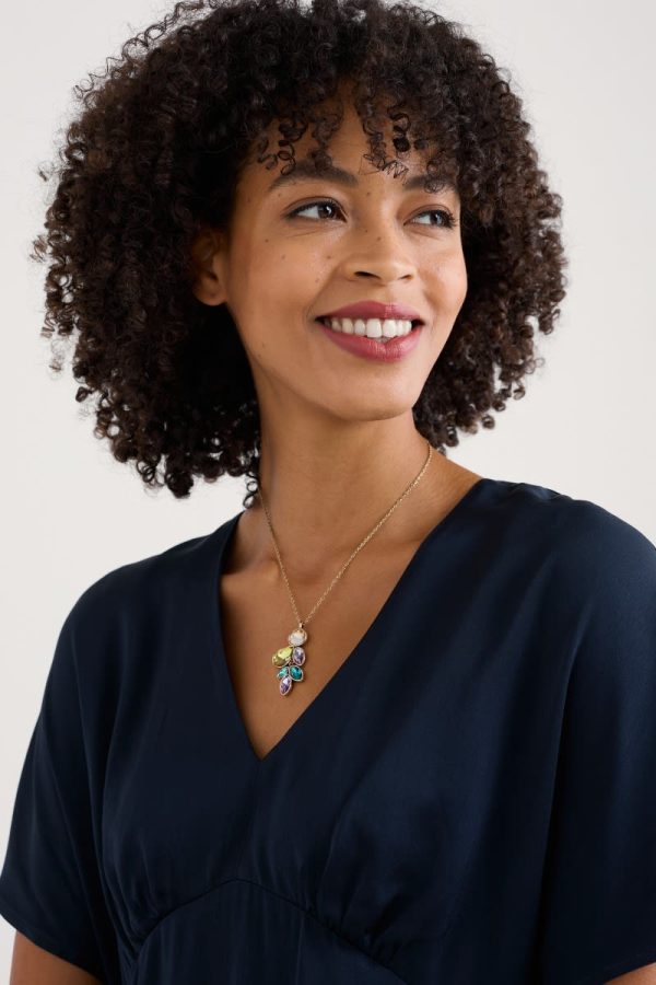 A cascade pendant made from a cluster of multifaceted stones in colours that complement our seasonal palette. The stones sparkle against the warm tone of their brass setting, and the pendant is suspended elegantly from a slim adjustable chain. Look out for other light-catching pieces from our Brilliance collection.