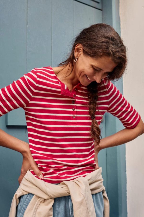 Meet your new everyday favourite, made from soft organic cotton jersey with ribbing and a gently fitted shape, complemented by slim half sleeves. The placket adds a neat touch, and the functional buttons let you choose how to wear the neckline. Perfect for styling through the seasons, layered with your dungarees or on its own.