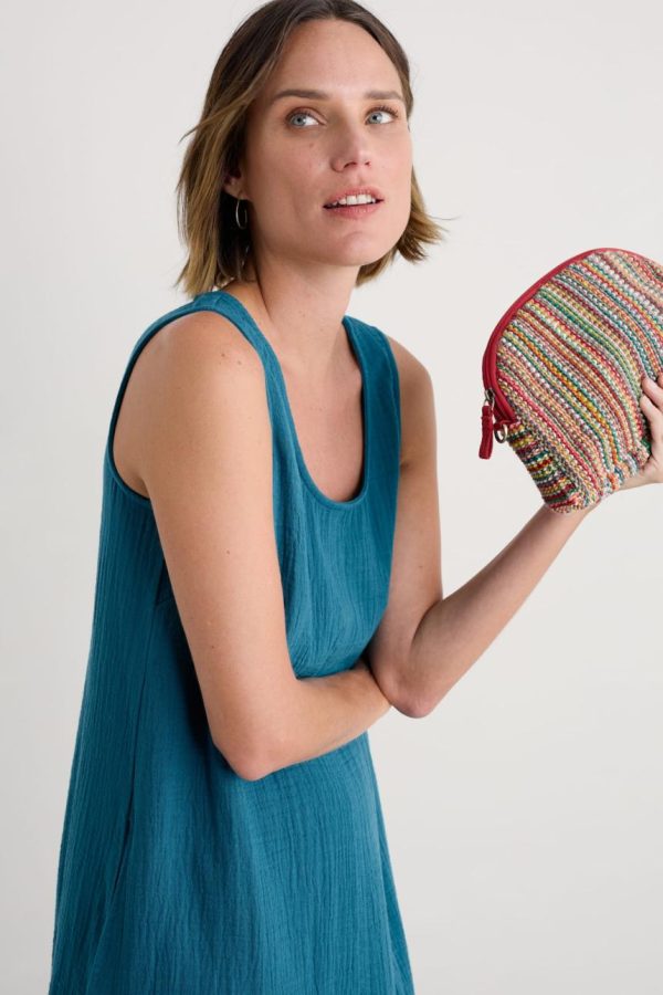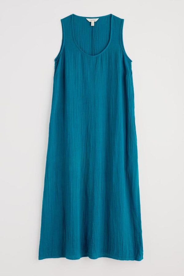 Sway through the summer in this long, sleeveless dress. It’s crafted from woven GOTS-certified organic cotton with a subtle textured finish – beautifully cool and breathable to wear. The dress has a loose, flared fit, and we’ve added bust darts for a touch of shaping.