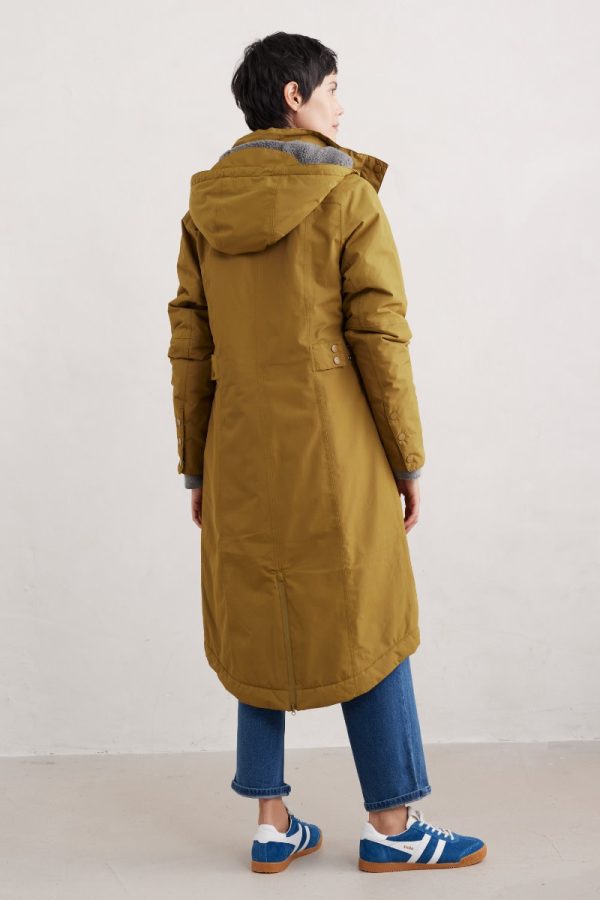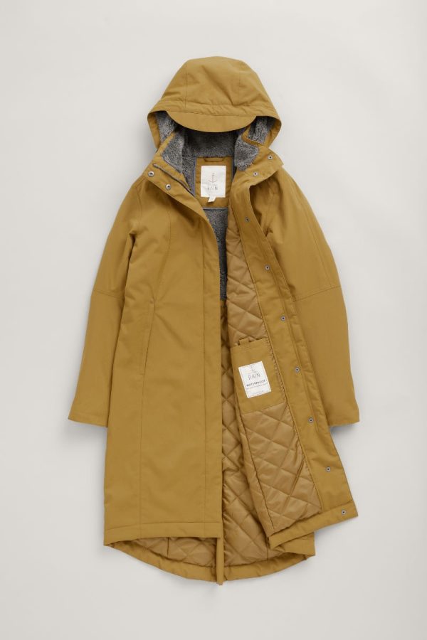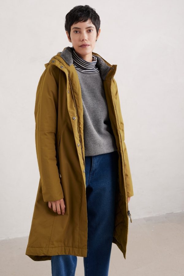 Made to last from year to year, our much-loved Janelle raincoat has a recycled nylon Tide Cycle® outer. Its relaxed shape allows for plenty of cosy layers underneath, and it falls to the knee for extra coverage. The upper half is lined with soft recycled fleece, while quilted lining at the bottom gives you ease of movement as well as warmth. Designed for the Cornish elements, the detachable hood has a peak to protect your face, and there are reflective strips for cloudy days and nighttime walks.