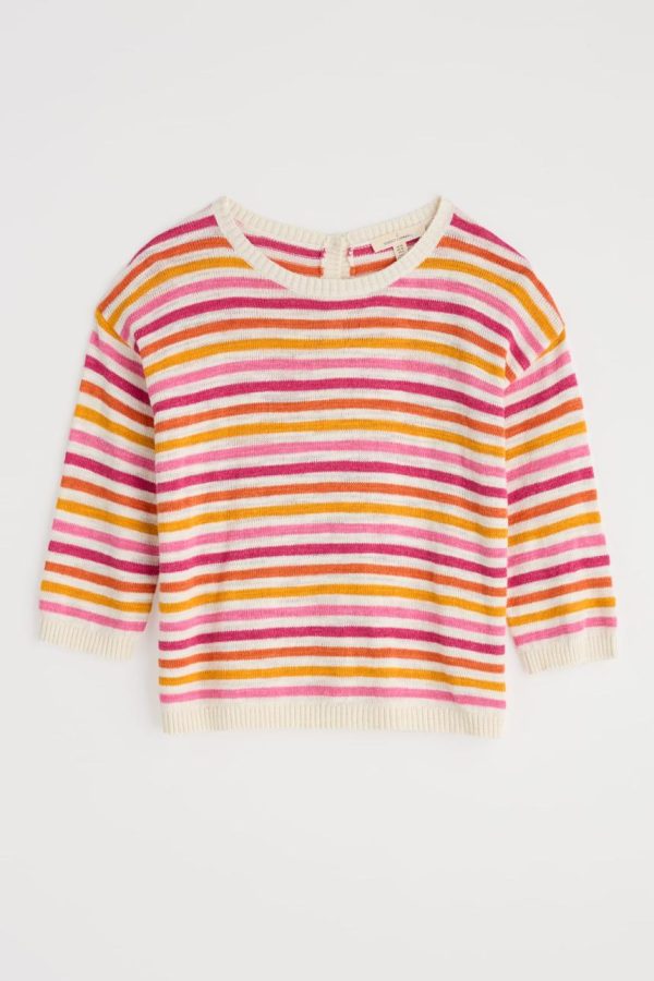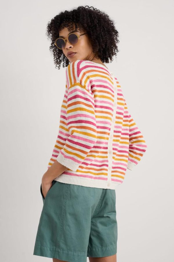 A relaxed-fitting jumper in cool and comfortable cotton linen slub yarn with a beautiful natural texture. This striped, textured knit has a flattering boat neck and elbow length sleeves and is finished with rib detailing on the neckline, cuffs and hem and functioning buttons on the back. A slightly shorter style, it finishes at mid-hip, so it’s perfect with skirts and our linen trousers.