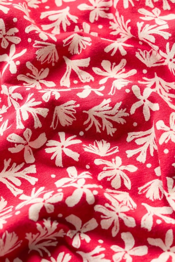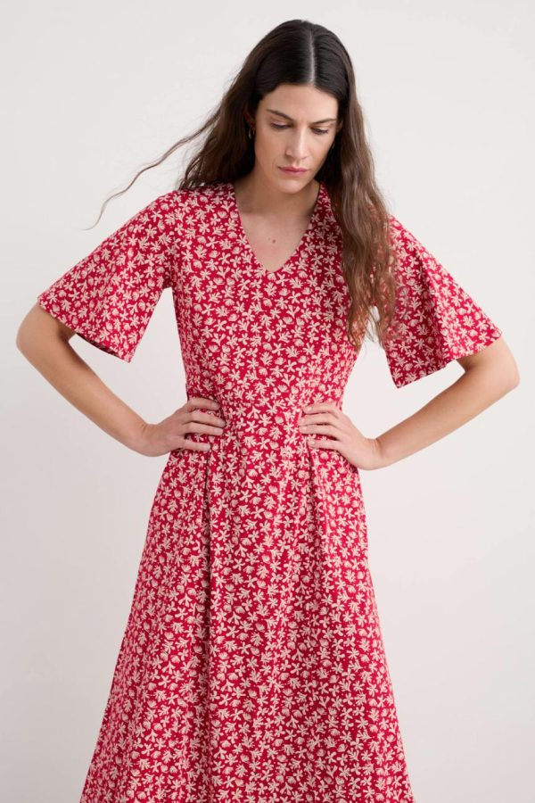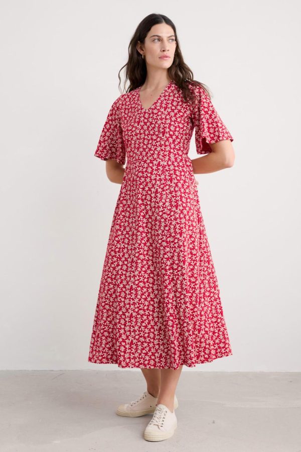 Our pretty printed dress is made from a soft jersey blend with organic cotton. Its soft fluted sleeves are balanced by the deep V-neckline, while the gently fitted bodice flows out into a long, full skirt, crafted from four panels for a lovely drape. An effortless dress for those easy summer days.