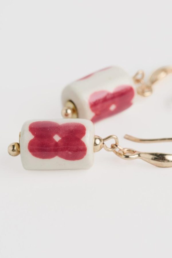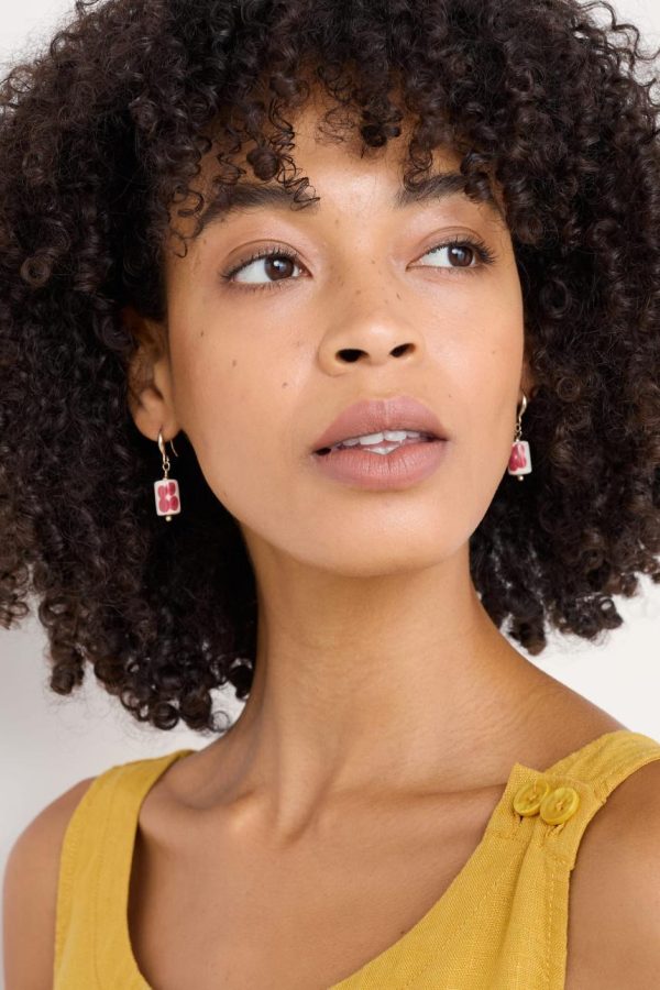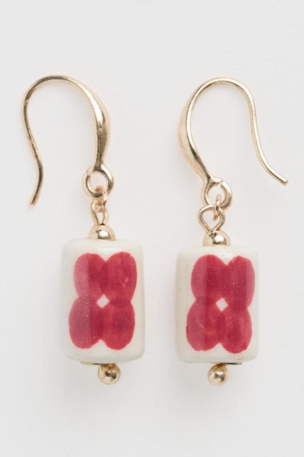 A simple drop earring with a single bead, stamped with four-petal flowers, on a short gold tone chain which gives it a lovely, easy movement. Pairs with our Noon Moor Necklace or our Collan Necklace.