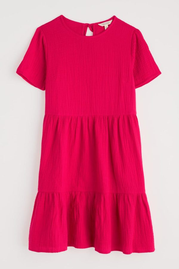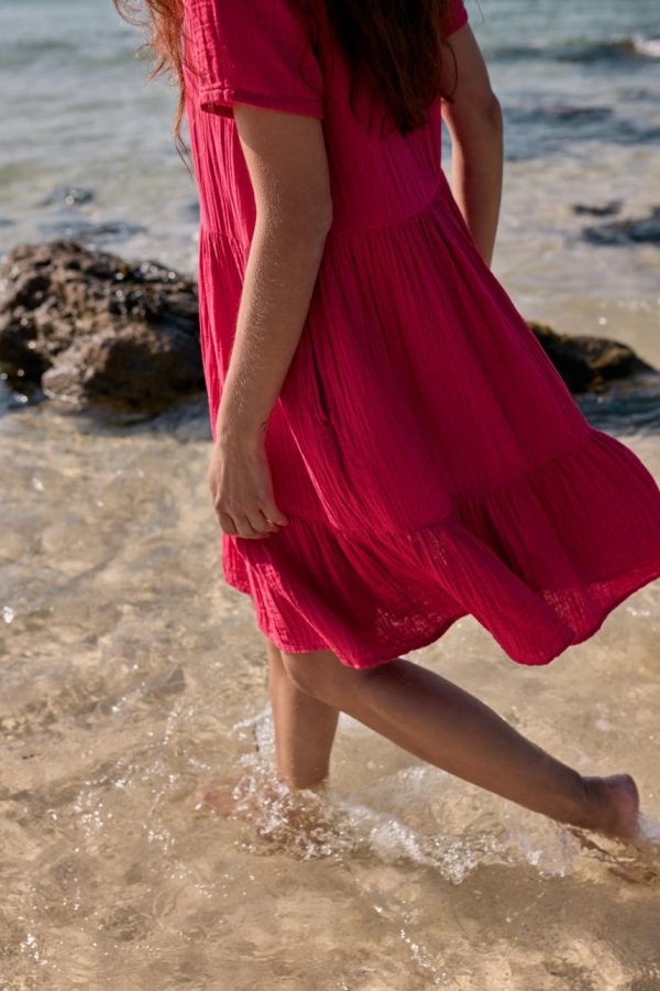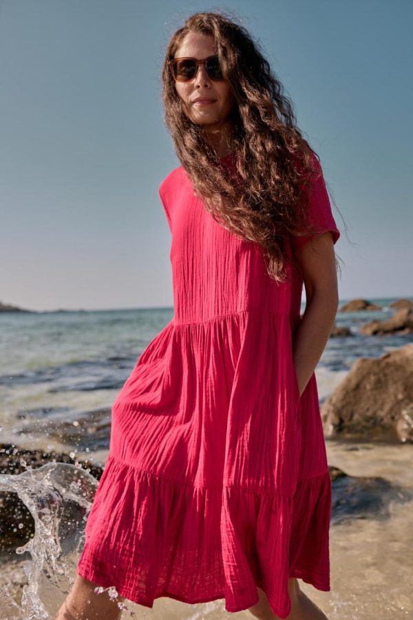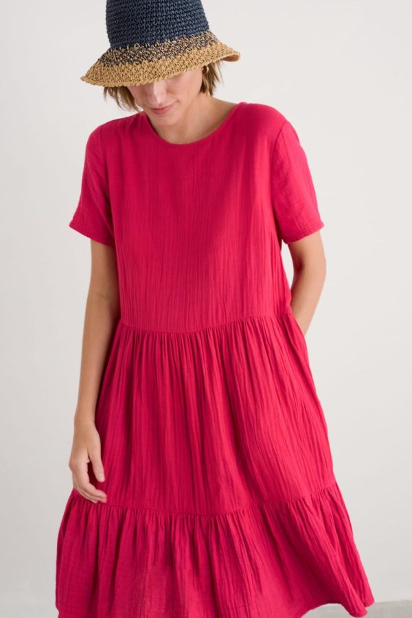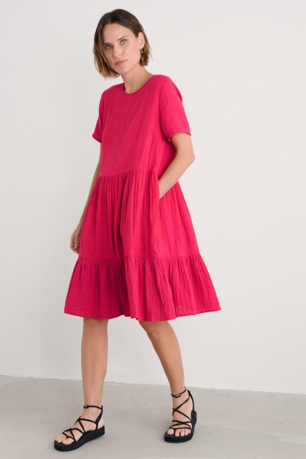 An easy on-the-knee dress with subtle tiers, made from new, beautifully soft and breathable double cloth fabric. Two layers of loose-weave organic cotton are layered together to create a dress that feels airy but substantial, elegant but with a relaxed crinkle. Perfect for holiday packing.