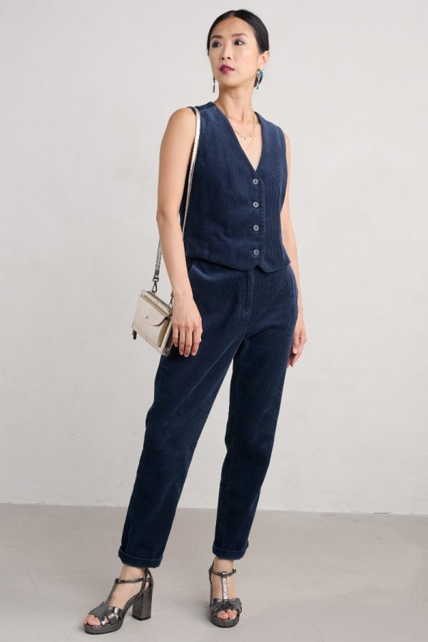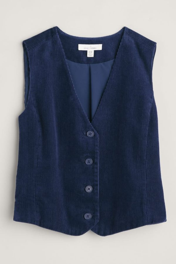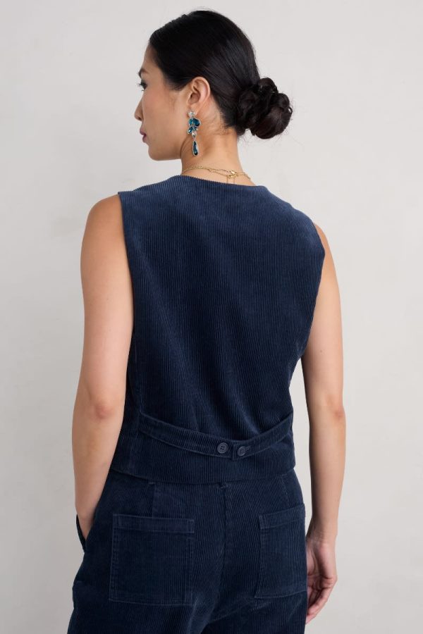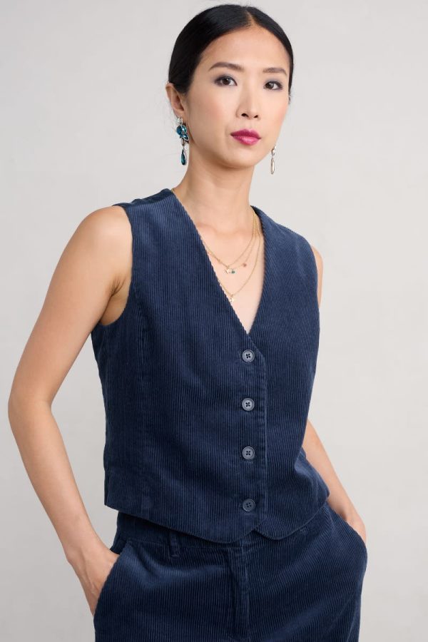 Our contemporary version of the classic waistcoat, crafted from soft organic cotton corduroy. Princess seams shape the waistcoat for a fitted outline, while its short length gives it a smart, tailored feel. We’ve taken time-honoured waistcoat details, such as the front button fastening and curved hem with side splits, and the adjustable self-fabric belt at the back. Wear it open over printed pieces or buttoned as a smart V-neck vest.