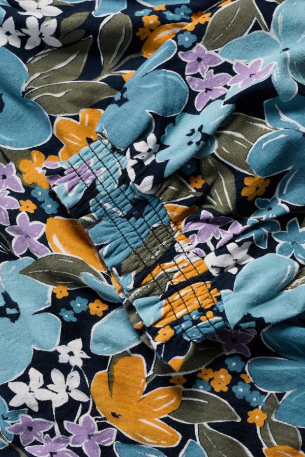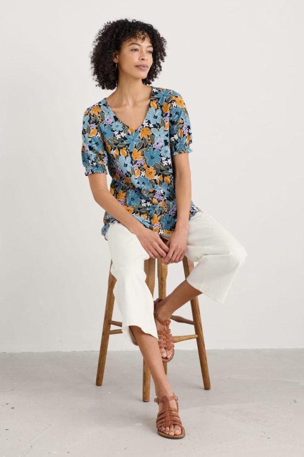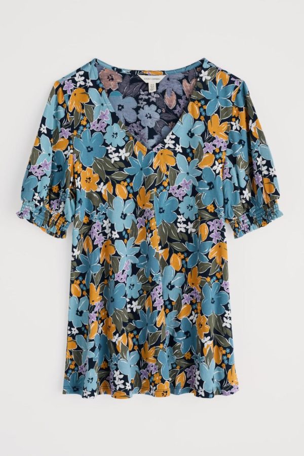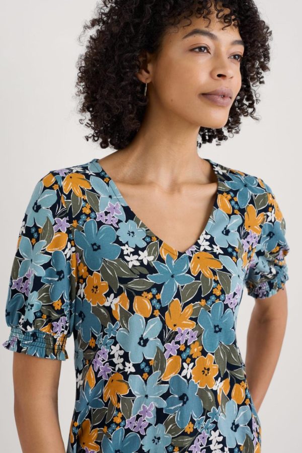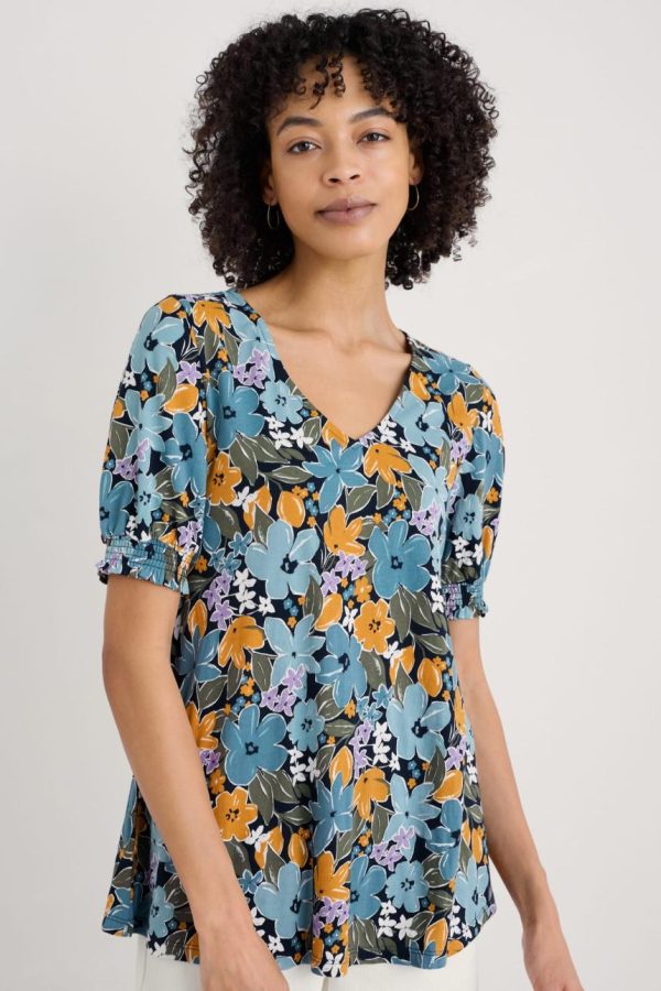 A flowing, easy-fit V-neck top with a vibrant print and a lovely drape at the hem, perfect for wearing loose over trousers. Smocking at the cuff gives a gentle volume to the sleeve.