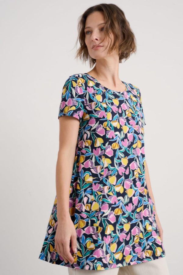 Fresh for the coming season, our short-sleeve jersey tunic blooms in a new floral print. It’s made from soft organic cotton, with a dash of added stretch for comfort and fit. Front seams create a lovely, flowing shape that drapes beautifully as the tunic flares out towards the hem. In-seam welt pockets add a pleasing finishing touch.